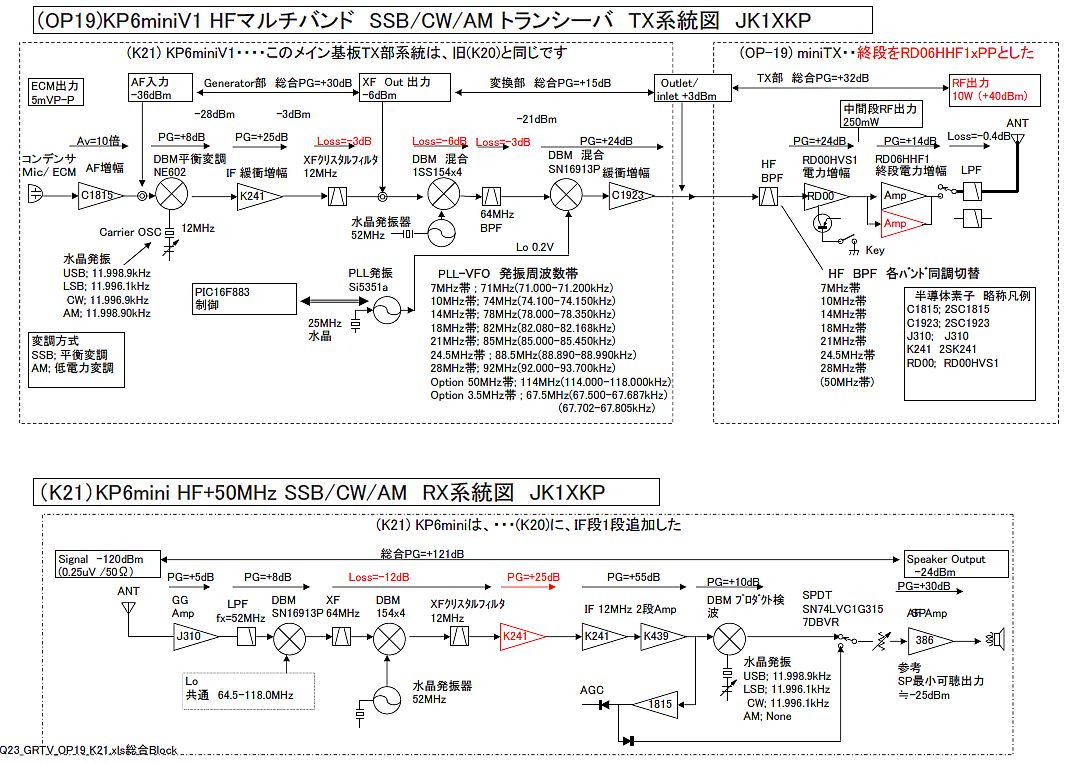 (K21)では受信部増幅のみの変更で、TX部系統は、(K20)とまったく同じなので、親基板(K20)+送信部(OP19)でも10W出力になります。