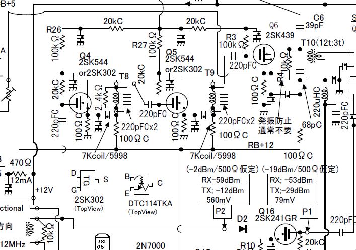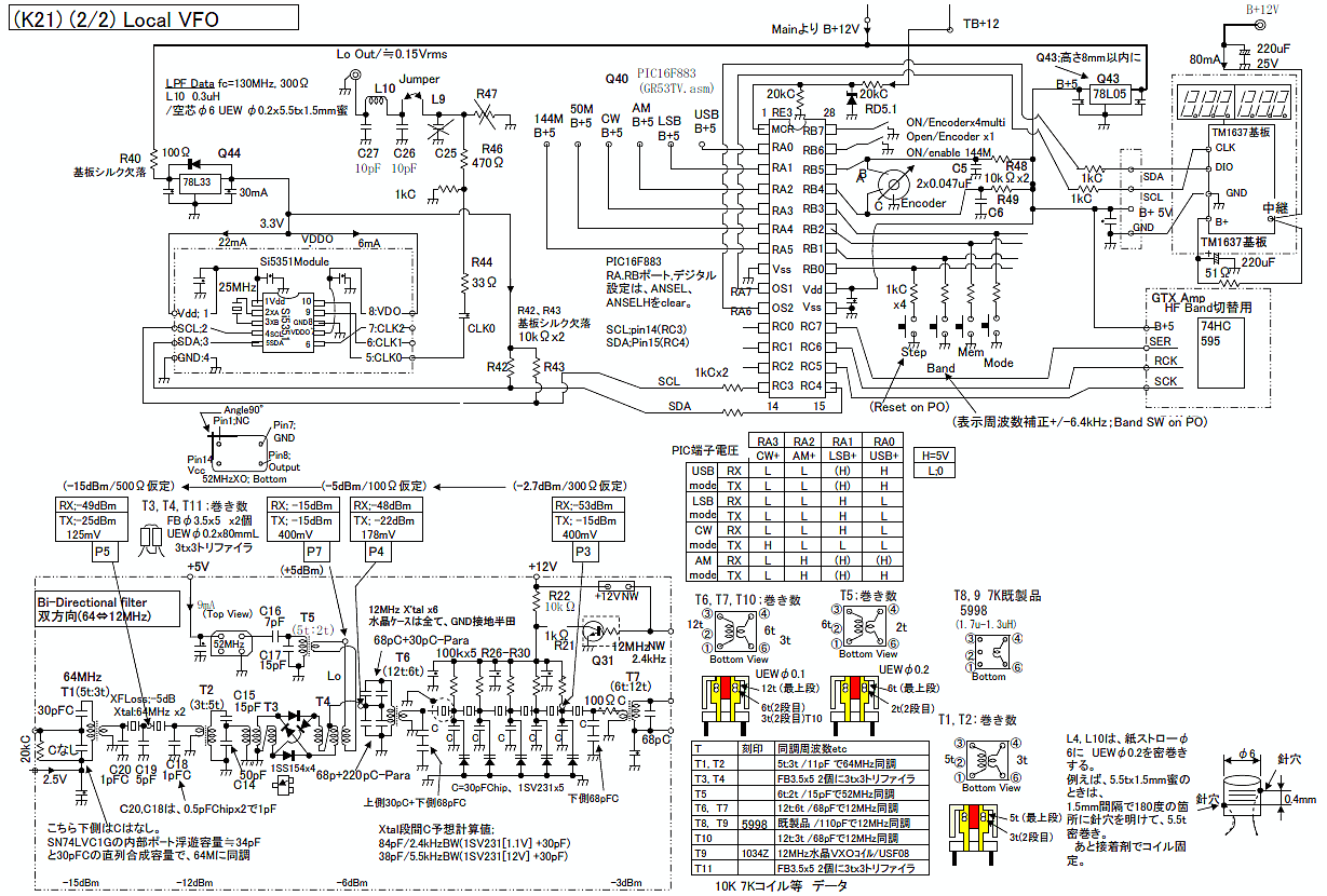 (K20)と比べ、(K21)KP6miniでは、IF12MHz増幅段に2SK302(2SK241 SMD版)を追加。送信系統はほぼ同一です。