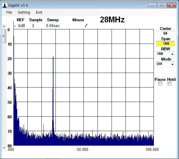 22MHz付近のヒゲは、GigaST5内部雑音。 GigaST5は、-20dBm以上の信号を入れると、内部で高調波を生成するようで、これ以上のレベル信号を、入力できない。