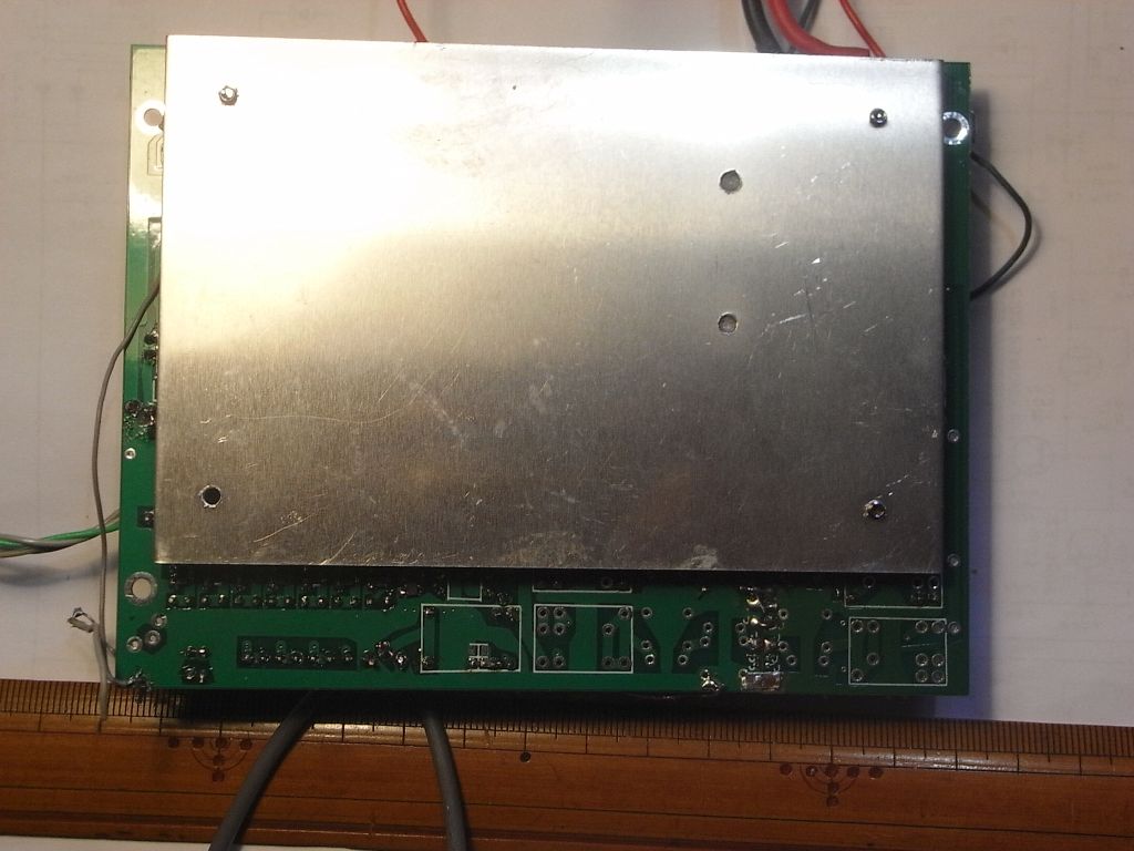 以下左は、基板裏面に放熱板(アルミ80x120x3t)を取り付けた状態。このリニアは、消費13.5Vx1.6A程度で10Wを出力し、効率50%位で、放熱量は少な目なので、この程度の放熱器でも、少し熱くなる程度で収まる。