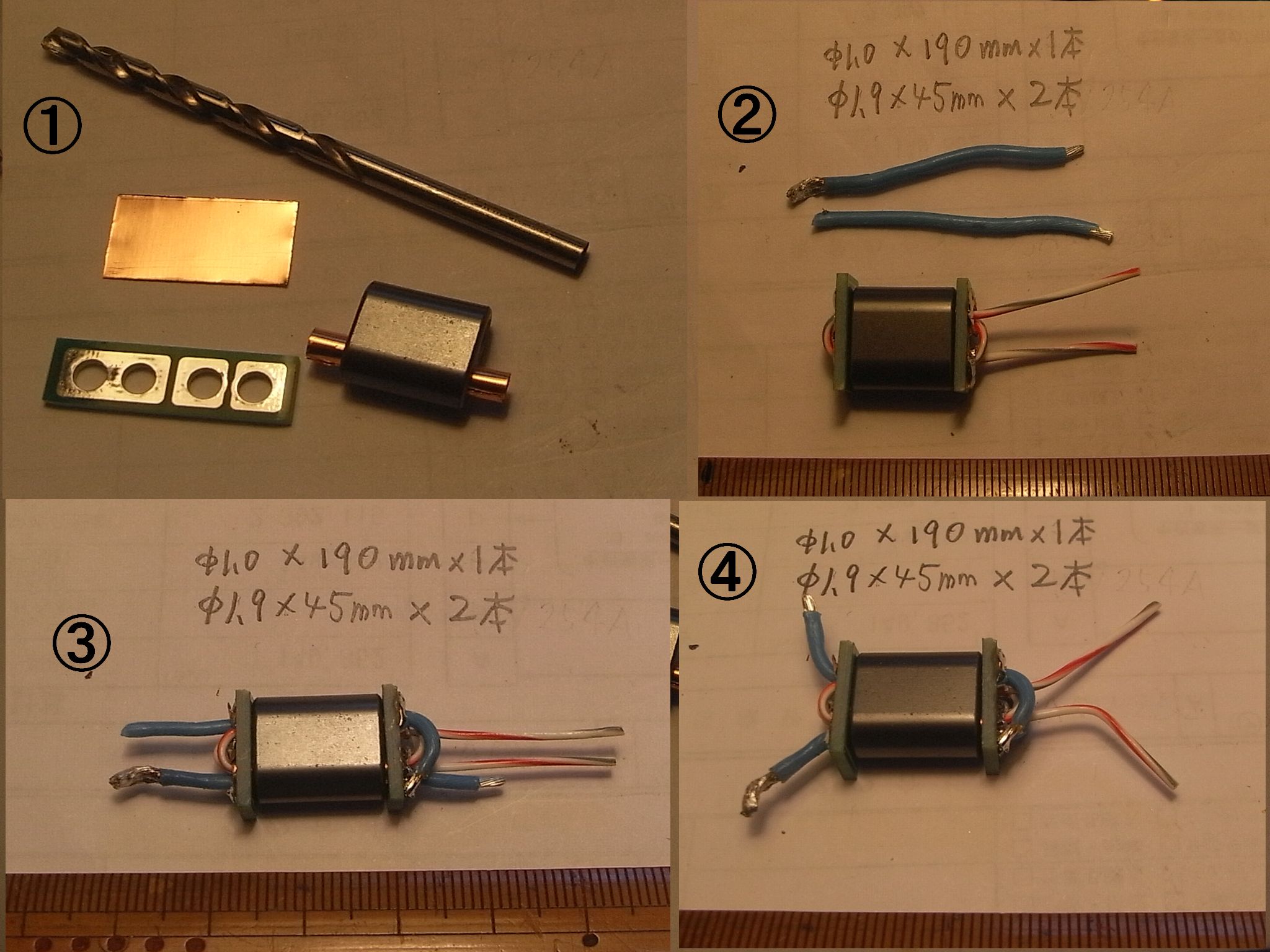 @ 0.1tx11.3x22.4mm銅板をφ4mmドリルに巻きつけ、筒状にして、フェライトコアBN-43-202に通す。2本。 写真のPCB4つ穴は、「直結二つ穴」と 「分離二つ穴」、はさみで二つに切る。