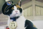 金線入り駅長帽子と“駅長たま”の丸札を付けた猫駅長