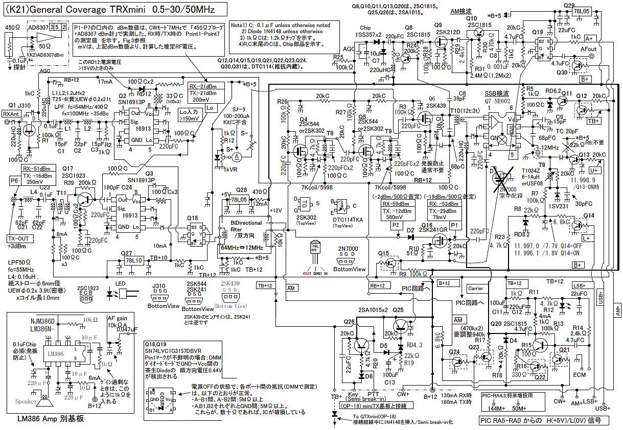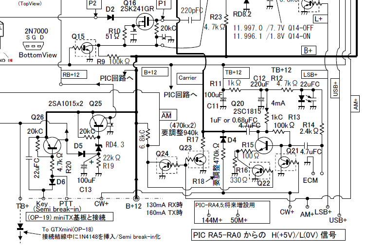 (K20)と比べ、(K21)KP6miniでは、IF12MHz増幅段に2SK302(2SK241 SMD版)を追加。送信系統はほぼ同一です。