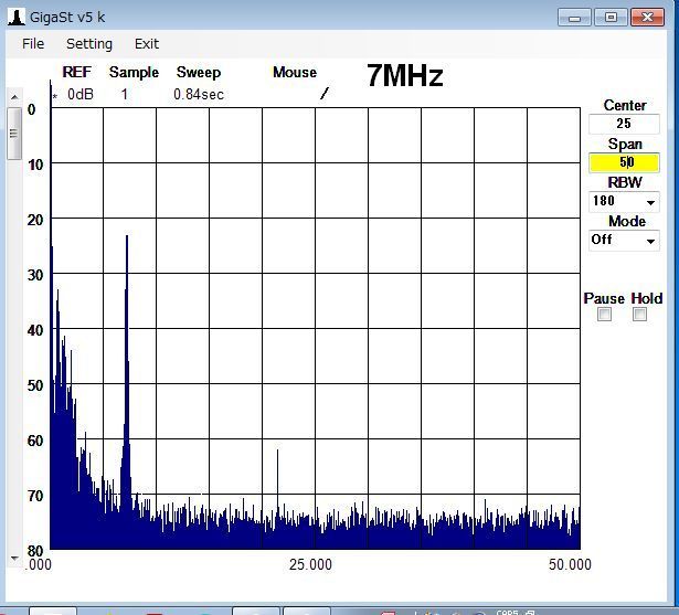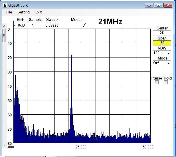 22MHz付近のヒゲは、GigaST5内部雑音。 GigaST5は、-20dBm以上の信号を入れると、内部で高調波を生成するようで、これ以上のレベル信号を、入力できない。