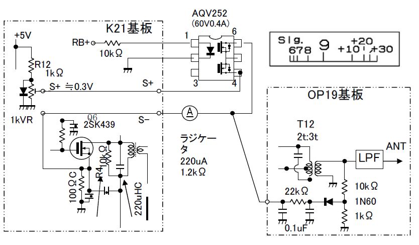 受信時には、フォトモスリレーAQV252の内部LEDを1mAで点灯させ、ピン4〜6間を導通状態にします。送信時は、LED点灯がOFFとなりますので、ピン4〜6間は、両方向電流を遮断し、送信機LPF入口のRF電圧で メータを振らせます。