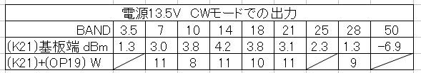 3.5MHz帯〜50MHz帯の出力を測定した結果は、周波数帯によりバラツキがあるが、下表のとおりで概ね10Wであった。