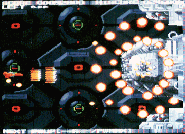 写真はラスボスです。ズズズと前後に動きながら、やたらハデな攻撃をしてきます。弾撃ちまくりです。上下の砲台は倒しても復活します。シャッターが閉まったかと思うとまた出てきます。ボスは放射状弾とチカチカ砲台弾が攻撃をしてきます。しかし、ぢつはこのボスは楽勝だったりします。なんでかというと、アイレムが得意だったアレがあるんですよ。タマキコウジっていえばわかるかな?