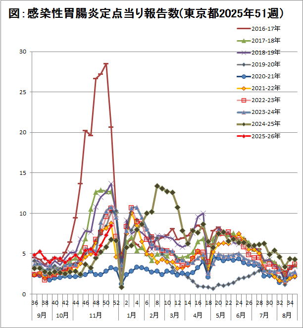 ノロウイルス食中毒と密接に関係するデータ 東京都の感染性胃腸炎の定点報告疾病集計表によると 2025年の第51週(12月15日〜12月21日)は8.46でした。 |