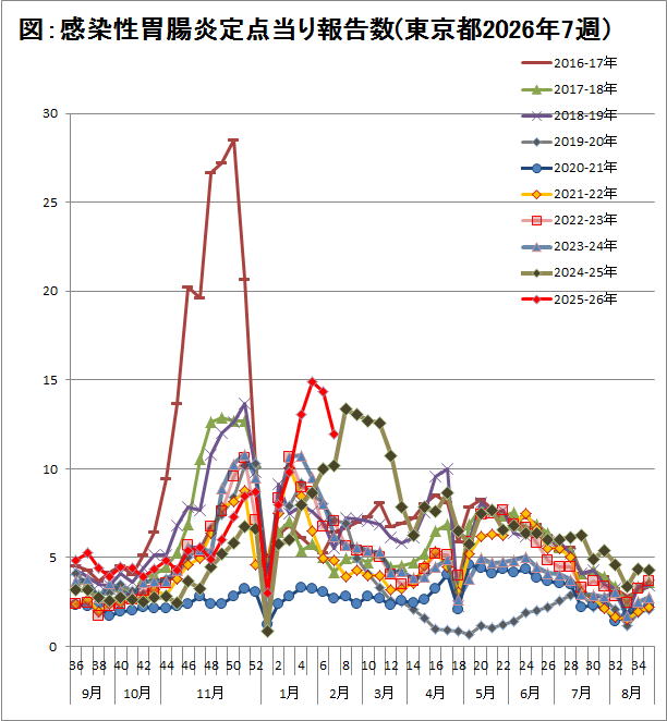 ノロウイルス食中毒と密接に関係するデータ 東京都の感染性胃腸炎の定点報告疾病集計表によると 2026年の第7週(2月9日〜2月15日)は11.96でした。 |