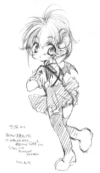 2002年1月21日 ほとんど初期 最初は金色の目に赤い髪の勝気な 少女の悪魔っこという設定だった・・・服はミリタリー(?)ぽくしたかったのに 挫折してしまったというのは秘密の話 |